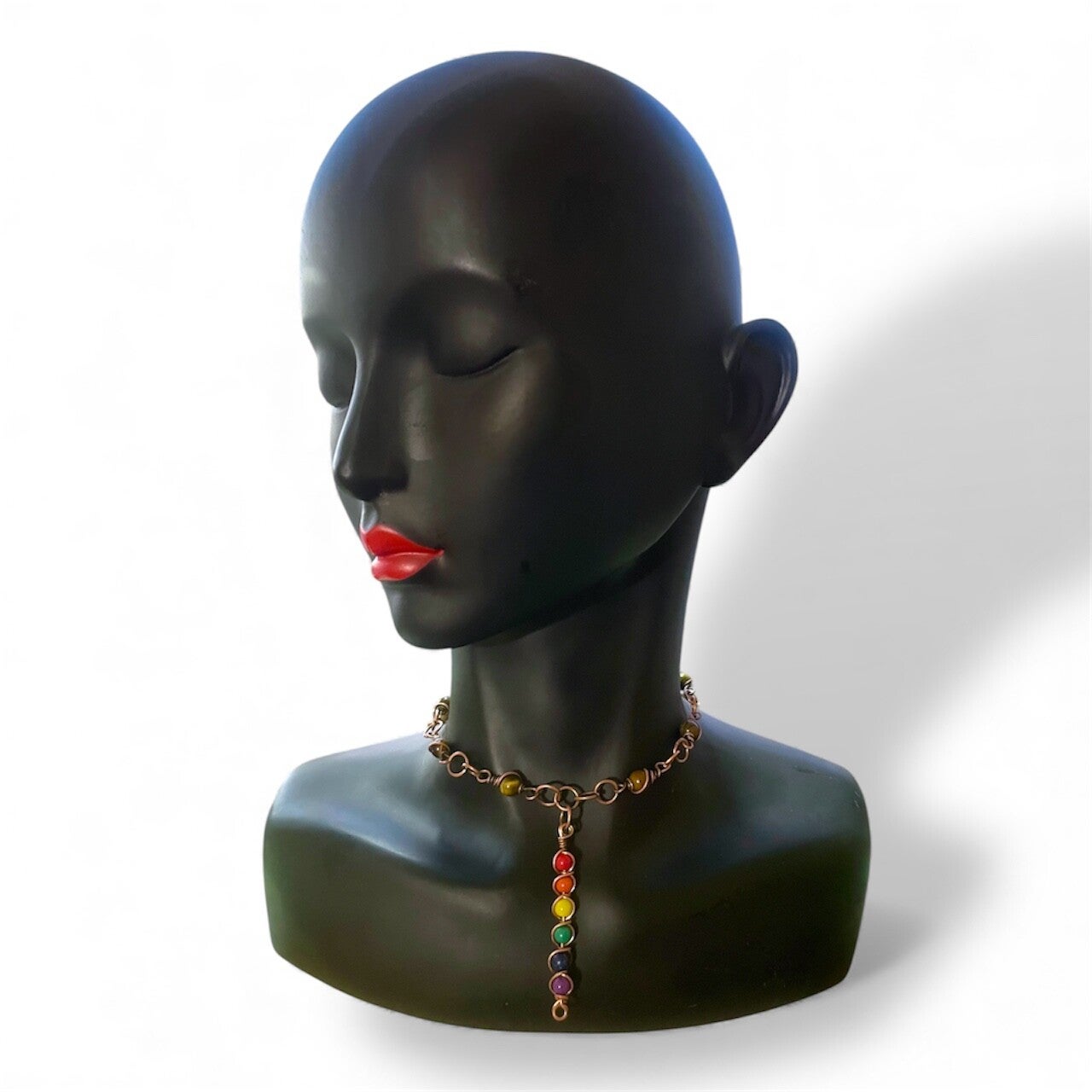 A sleek design of rainbow gemstones drops from a handmade chain, delivering color, clarity, and attitude. Customize with or without tiger’s eye beads depending on your vibe. It’s a little spiritual, a little stylish, and a whole lot of “I know who I am.” Only available in copper wire.